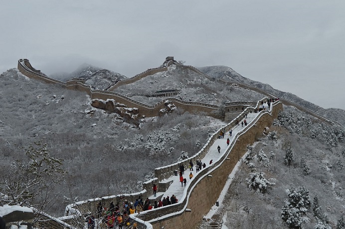 第二天的七點,我們就到達了天下第一雄關(guān)居庸關(guān),開始攀登八達嶺長城。八達嶺長城,位于北京市延慶縣軍都山關(guān)溝古道北口,是明長城的一個隘口,為居庸關(guān)的重要前哨,古稱“居庸之險不在關(guān)而在八達嶺”。萬里長城,雄偉險峻,雪中的長城更是如此。山巒重疊,形勢險要,氣勢極其磅礴的城墻南北盤旋延伸于雪山峻嶺之中,視野所及,不見盡頭。